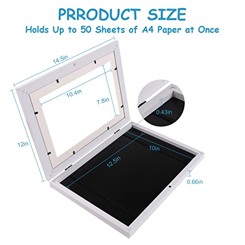 Ample Storage Capacity: The child artwork frame with storage measures 13.8″x10.4″, and the inner frame measures 11.8″x8.3″, with a depth of 0.78″. This spacious design allows you to store and display A4 or smaller artwork. Depending on the thickness of the paper, it can hold between 50 to 100 pieces, providing ample storage for your child’s artistic creations.