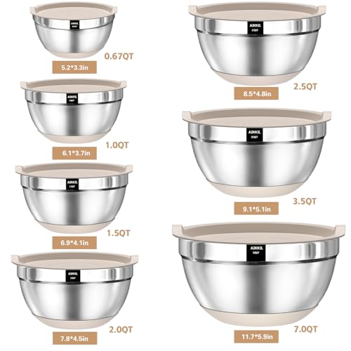 Home » Baking » AIKKIL Mixing Bowls with Airtight Lids, 20 piece Stainless Steel Metal Nesting Bowls, Non-Slip Silicone Bottom, Size 7, 3.5, 2.5, 2.0,1.5, 1,0.67QT Great for Mixing, Baking, Serving (Khaki)