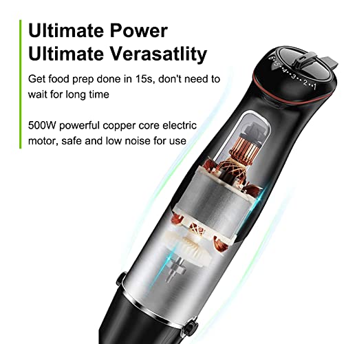 ??Powerful and Efficient Hand Blender?The hand blender is equipped with a 500W heavy-duty copper motor and 2 sharp 304 stainless steel blades, its highest rotation speed is up to 17000U/min, which can finely cut food, and help extract the maximum nutrients and vitamins from food, help make delicious smoothies, puree, soups, juices, salsa, sauces and more.