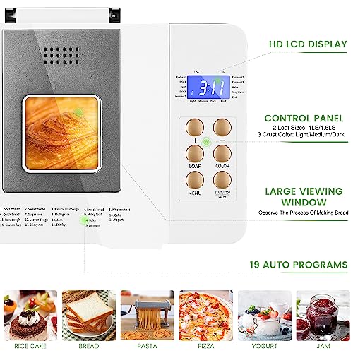 ??19 Nutritional Custom Settings & 550W Upgraded Dual Heaters?Multi-functional bread maker with 19 automatic programs to choose from Gluten-Free, French, Wholemeat, Sourdough, Dough Maker, Jam, Yogurt, Cake, etc. New Rice Cake and Stir-Fry settings offer even more options! The 550W high power bread maker has improved 360° dual heaters at the bottom and top of the bread pan to promote even toasting and browning of bread. Homemade bread is not only tasty but also healthier!