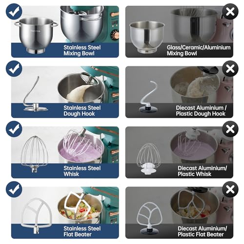 3 SS ATTACHMENTS DISHWASHER SAFE – Our household stand mixer comes equipped with an upgraded stainless steel accessory set, including a whisk, dough hook, and flat beater. These attachments ensure easy installation and long-lasting durability. Moreover, all stainless steel attachments are dishwasher-safe, allowing for effortless cleaning after use.