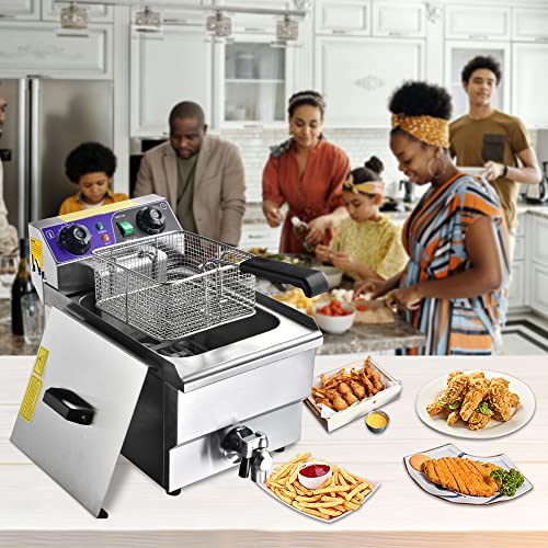 [Quick Heating]: 110V 1500W Countertop Deep Fryer, coiled long heating tube for quick heating up, take less than 15 minutes to fry 3Lbs chips; Use it to cook French fries, onion rings, fried chicken, funnel cake and any other deep-fried food for the whole family to enjoy, preparing party at home, church activities, also can be used for restaurant, snack stand, supermarket
