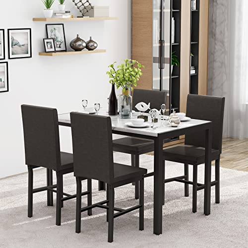 MIERES 5 Pieces Marble Sets, Table 4 w/Faux Leather Metal Frame Chairs for Dining Room, Kitchen, Breakfast Corner, 02 White