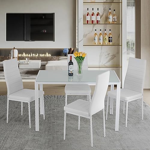 FDW Dining Table Set Glass Dining Room Table Set for Small Spaces Kitchen Table and Chairs for 4 Table with Chairs Home Furniture Rectangular Modern (White Glass)