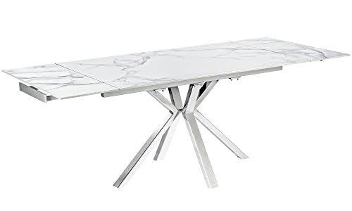 Modern Design – This contemporary dining table has 2 pull-out extensions leaves. The rectangular sintered stone top is 10mm thick, The chromed base with white marble finish will bring more style and elegance to your dining room.