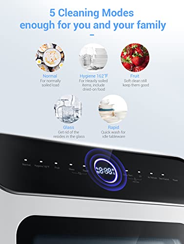 5 Cleaning Modes – This countertop dishwasher features 5 cleaning modes (Normal, Hygiene, Fruit, Glass & Rapid). Additionally, thanks to the two 360° rotating spray arms that clean at every angle, including some tough to reach spots, it cleans your utensils thoroughly.