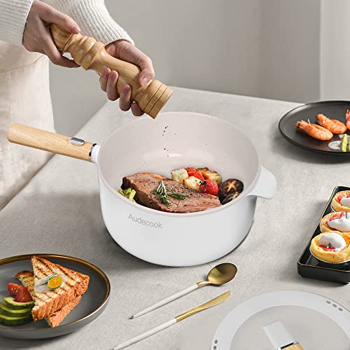 VERTICAL TEMPERED GLASS LID-The tempered glass lid of the Audecook electric hot pot is heat-resistant and explosion-proof. You can check and control the status of your non stick frying pan at any time, and retain the heat and flavor of your food during the cooking process, so your food comes out perfectly every time. At the same time, the vertical design can stand the glass cover on the desktop, saving more space for your desktop!