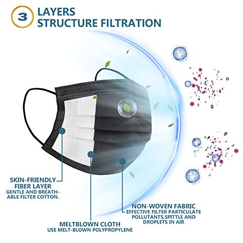 ?50PCS 3 Layers of Protection?Outer color layer is a water-resistant layer, say bye to splashing liquid;Middle layer is a filtering layer, say bye to particles from 0.3 to 1.0 pm;Inner layer is a water absorbing layer, which can absorb the moisture from the breath of the wearer, avoid the filtering layer from getting wet
