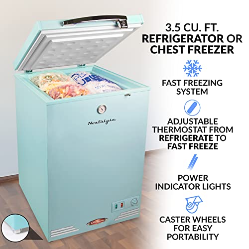 Nostalgia Classic Retro 3.5 Cu.Ft. Chest Freezer and Refrigerator All in One, Includes Rolling Wheels, Portable, Indoor/Outdoor, Lock and Keys, Removable Basket, Adjustable Temperature Dial with Gauge