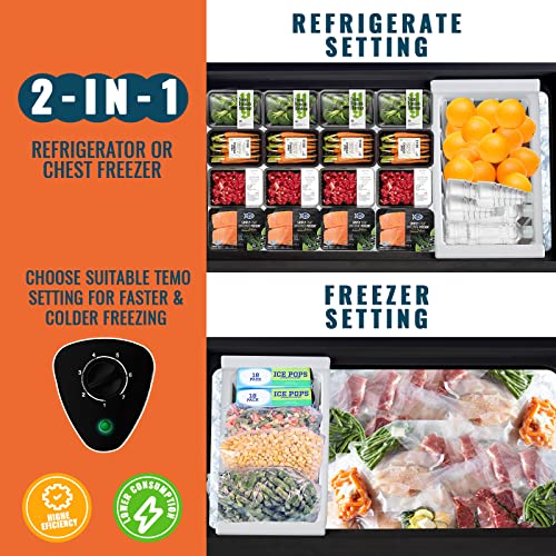 • ??ADJUSTABLE TEMPERATURE PANEL?Deep Freezing & refrigerate in one machine. Its temperature regulation range is – 11.2 °F~ 50°F which will meet the demands of most people under different ambient temperatures. At the same time, the D-shaped condensing tube can most effectively remain the temperature low in the chest freezer to cool down without waiting too long.