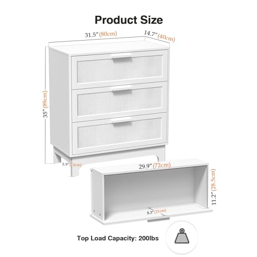 ?Ample Storage Space?This rattan dresser size is 31.5″W x 14.7″D x 35″H.The three large drawers offer ample storage capacity to organize clothes, blankets, scarves, socks, and other accessories. Additionally, you have the option to combine two cabinets to create a six-drawer farmhouse dresser, further expanding your storage possibilities
