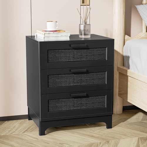 Anmytek Rattan Nightstand with 3 Drawers, Farmhouse Night Stand with Nature Rattan Storage Drawers, Black Wood Bedside Table Sofa End Side Table for Bedroom Dorm Small Spaces, 15.5”D x 19.7”W x 23.6”H