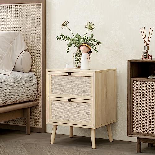 Rattan Nightstand Set of 2, End Table Rattan Bedside Table Side Table with 2 Hand Made Rattan Decorated Drawers Wood Accent Table with Storage 2-Drawer for Bedroom, Living Room, Natural 2 Pack