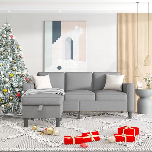 ZeeFu Convertible Sectional Sofa Couch,Light Grey Linen Fabric Modern Upholstered 3-Seat L-Shaped Sofa Furniture Set with Reversible Storage Ottoman and Pockets for Living Room Small Space Apartment