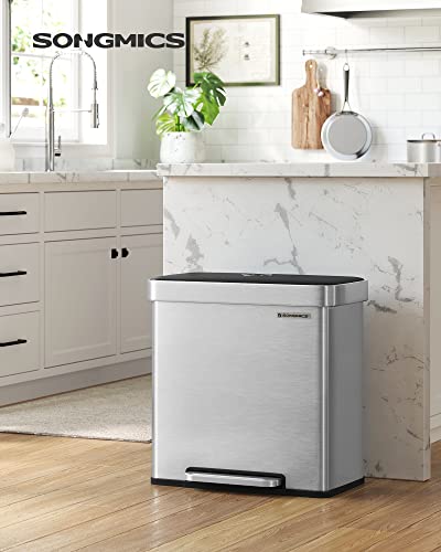 [Dual Compartments & Liners] With two 8-gallon compartments, this dual trash can helps sort normal waste and recyclables in your kitchen; it comes with 15 custom-fit SONGMICS trash bags (code 30A), which are designed to perfectly fit this garbage can