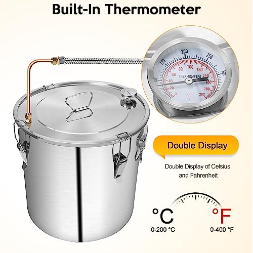 Easy to Operate – The alcohol still kit has a real-time thermometer on the lid, with a dual display of Celsius and Fahrenheit, which is convenient for monitoring the temperature of the wine during the distillation process.