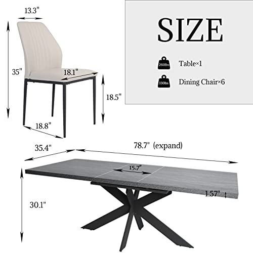 Jellci Dining Room Table Set for 6, Rectangular Kitchen Dining 63” to 79” Extendable Table for 6-8 People, Slate Stone Kitchen Table with 6 Upholstered Dining Chairs(1 Table, 6 Beige Chairs)