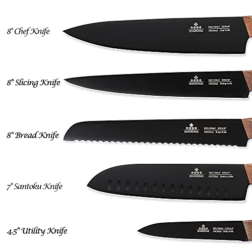 ?1-YEAR WARRANTY – ENOKING is dedicated to improving your life and committed to ONE YEAR guarantee to this kitchen knife sets for all buyers! To protect the sharpness and glossiness of the knives, please DO NOT wash the knives in dishwasher. Please Clean and dry them immediately after hand washing to get the most out of them.