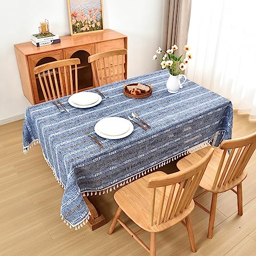 Veblandy Rustic Tablecloth Embroidered Linen Tablecloths with Tassels Farmhouse Dining Table Cover for Kitchen Wrinkle Free Table Cloth for Rectangle Tables, 55″x86″, 6-8 Seats, Blue