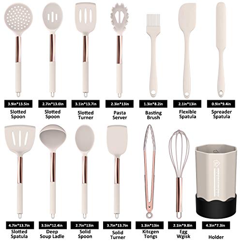 ??PREMIUM QUALITY KITCHEN TOOLS DESIGNED TO LAST A LIFETIME?Soft food grade silicone head prevent from scratching your cookware such as nonstick pots and pansand, no rust long copper stainless steel handle protect your hands from being scalded. No more worries about melting or rusty kitchen utensils! Our kitchen gadgets are polished with a special top-grade oil for longer time using not bend, break or rust