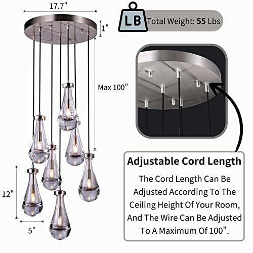 7 Light Raindrop Chandeliers, Adjustable Rope Pendant Lights Kitchen Island, Teardrop Pendant Brush Nickel Dining Room Lights Fixture Hanging Lamp Ceiling For Entryway Hallway Living Room Staircase