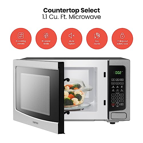 Chefman Countertop Microwave Oven 1.1 Cu. Ft. Digital Stainless Steel Microwave 1000 Watts with 6 Auto Menus, 10 Power Levels, Eco Mode, Memory, Mute Function, Child Safety Lock, Easy Clean