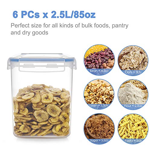 Perfect for Kitchen Pantry Organization– The food storage container set includes 12 pcs 2.3qt containers (6” l x 6” w x 6.8” h). Ideal for storing 3lbs of flour, sugar, brown sugar, rice, grain, pasta, beans, chips, cereals, crackers, cookies, nuts, oats or other dry foods or bulk foods.