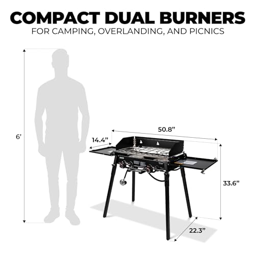 OUTDOOR LIVING PERFECTED – Complete your outdoor camp kitchen with our 2 burner propane stove. Designed for the chef on the go, the portable camp stove features removable legs, windbreak, and carrying handles.