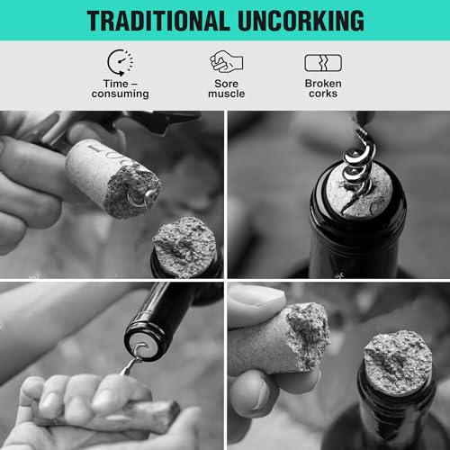 • With included 4 AA batteries, this electric corkscrew wine opener can open over 50 wine bottles every battery change, Enjoy hassle-free wine opening