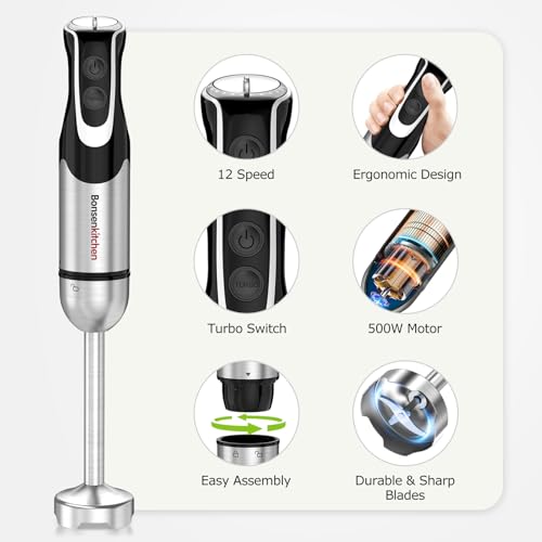 Click for More Images 4-in-1 Multifunctionality for Complete Kitchen Tasks This Bonsenkitchen immersion blender handheld is your all-in-one kitchen solution. The 4-in-1 hand blender set includes a powerful blending shaft, an egg whisk, a 24oz...