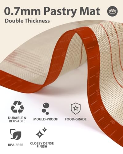 Click for More Images [2026 THICKNESS UPGRADE] The silicone baking mat is made of 100% food-grade silicone and is 0.7 mm thick.[NONSTICK SURFACE] No need to dust with flour. Fold or roll up for storage after dishwasher cleaning.[NON-SLIP BOTTOM]...