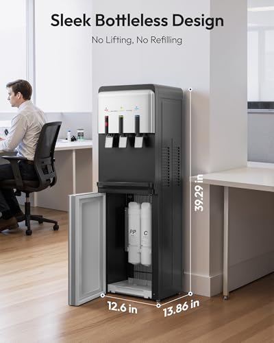 Click for More Images Three Temperature Settings:This water cooler fits all daily scenarios — grab icy cold water (39°F–50°F, 0.68-gallon capacity) post-jog, refill with room temp water at your desk, or use piping hot water...