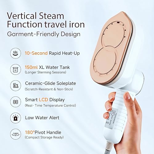 Click for More Images 2-in-1 Travel Steamer: This steamer for clothes seamlessly switches between a clothes steamer handheld (for hanging garments) and a steam iron (for tabletop use). A single button lets you turn the steam function on/off and...