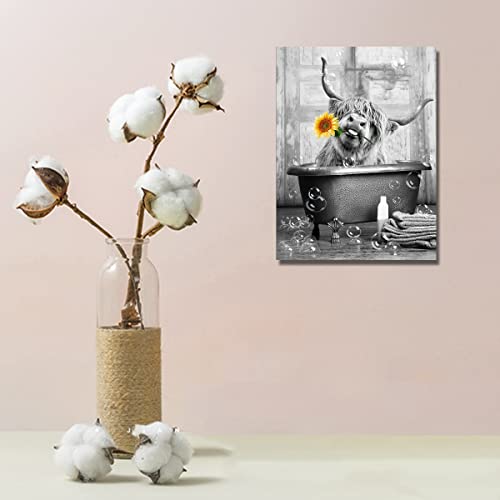 Highland Cow Wall Art in Bathtub Canvas Print – Black and White Photo Bubble Funny Cattle Pictures Animal Painting Farmhouse Artwork 12×16 inch for Wall