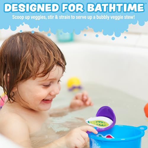 Click for More Images FUN IN THE TUB: Scoop, strain & serve up a bubbly veggie stew! Gather floating foam veggies, season, stir & strain for yummy Tub Soup—engaging toddler bath toys for a bubbly, imaginative kids bath!SCOOP, STRAIN & PLAY: Use...