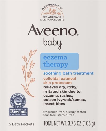Click for More Images 5-packets of Aveeno Baby Soothing Bath Treatment to help relieve dry, itchy, irritated skin due to rashes, eczema, poison ivy/oak/sumac, or insect bitesThis unique baby eczema therapy bath combines a special moisturizer and...