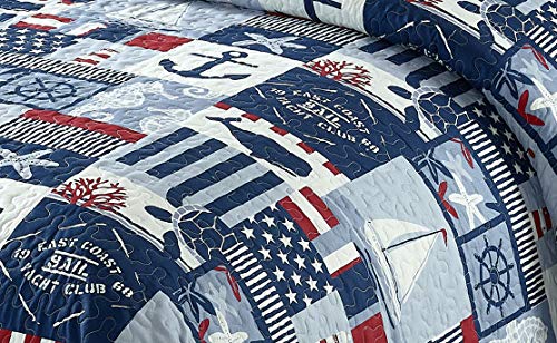 Click for More Images Red white and blue patchwork of marine and yacht sailing elements - anchors, sail boats, ship wheel, light house, starfish, seahorse, coral reef, and marina yacht club logo. starsFull / Queen: one oversized bedspread...