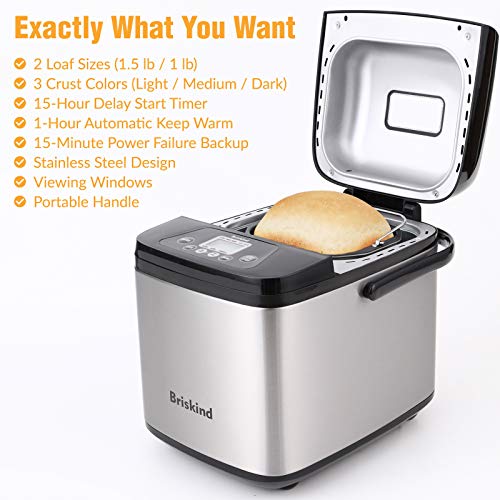 Click for More Images Briskind bread maker features 19 programmed settings including Basic White, Rapid Bread, Gluten-Free, French, Cake / Quick Bread(no yeast), Whole Wheat, Oatmeal, Rye, Multigrain, Sweet Bread, Sugar Free, Low Carb, Sourdough...
