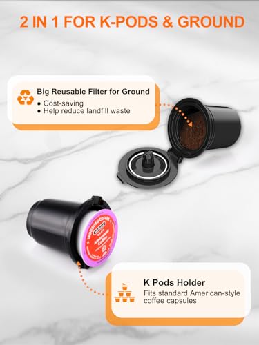 Click for More Images ?Brew in 2 Ways?Karosie single serve coffee maker is compatible with both K pod and ground coffee, which satisfies the diverse taste needs of coffee lovers. With a brewing capacity of 6–12 oz, it features a one-button...