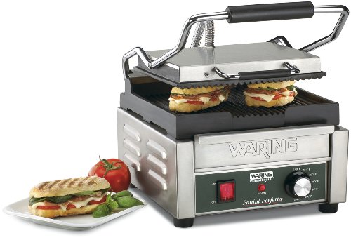 Click for More Images 9.75" x 9.25" cooking surfaceRibbed cast-iron platesBrushed stainless steel body and removable drip trayHinged, auto-balancing top plate suits foods up to 3" thickUL, NSF More Information...