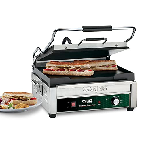 Click for More Images Sandwich Grill, electric, countertop, double, 19" x 9" flat cast iron grill surface, hinged top plate, power/ready lights, removable crumb/grease tray, adjustable thermostats up to 600° F, stainless steel, 120v/60/1-ph, (2)...