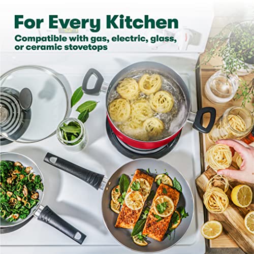Click for More Images Kitchen Cookware Set 12 piece - Include 8-inch fry pan / 9.7-inch fry pan / 9.7-inch Deep Fry Pan with lid / 1.5Q saucepan with lid / 3Q casserole with lid / 5Q casserole with lid / 2 pcs nylon utensils. The Interchangeable...