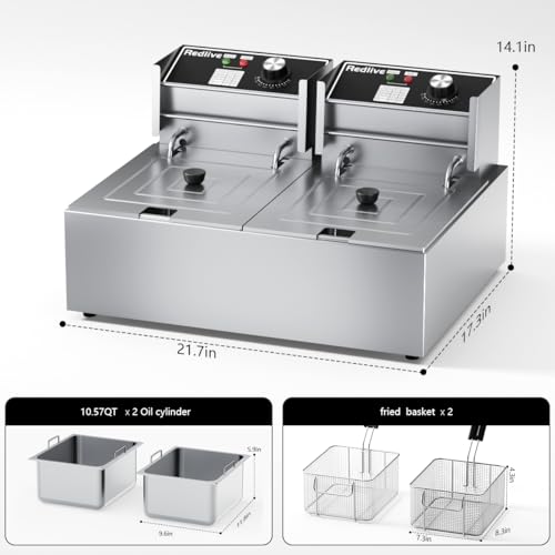 Click for More Images ?Electric Deep Fryer?Equipped with 1700W×2 U-Shaped heating tubes, 10.7 QT×2 Oil Tank?11.16QT Large Basket and 6.35 QT×2 Baskets. The temperature can be controlled within the range of 140°F (60°C) - 390°F...