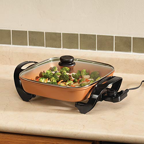 Click for More Images Electric skillet/frying pan features a Titanium infused surface that cooks up to 30% faster than ordinary nonstick surfaces to save Energy and time, and is PFOA- and PTFE-freeIntegrated lift & serve hinged lid allows for...