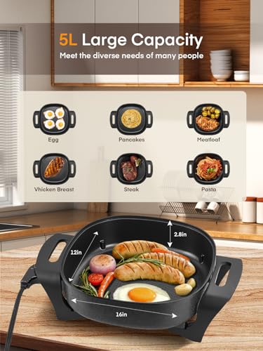 Click for More Images 12-Inch Large Capacity - electric skillet with 2.8 inches deep, 5-liter volume, fits 3-5 people for roasting or frying. Whether you're making a family favorite or trying new recipes, our Electric Frying Pan can do it all,...