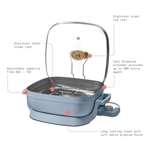 Click for More Images The beautiful 5-in-1 expandable skillet can sauté, steam, simmer, simmer, and more. It is the first electric frying pan on the market with a cast aluminum extender that provides 40% extra depth, increasing capacity from 5QT...