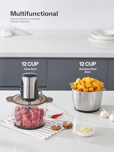 Click for More Images ?1.2L Processor & Easy Operation? Electric vegetable chopper with 5 cup bowl is large enough to serve food for your whole family. The stack & press design makes this mini chopper quite easy and safe to use, only press to run...