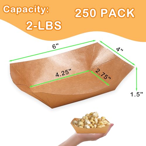Click for More Images Set includes 250 kraft paper food trays, each measuring about 4.25"x2.75" at the bottom, 6"x4" at the top, and 1.5" high. Suitable for holding up to 2 pounds of food, perfect trays for serving a variety of dishes.Our paper...