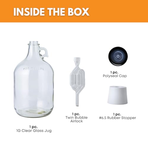 Click for More Images [What's Included?] This item includes 1 gallon clear glass jug (128 oz, 3.8 liter) with black polysealed lid, #6.5 drilled rubber stopper and a twin bubble airlock; a great addition to your wine making supplies and...