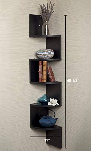 Click for More Images 5 tier wall mount corner shelves Made of durable MDF laminate.Beautiful espresso finish that suits almost any decor.Easy to mount with all necessary hardware Included.Decorative and functional for your home, office, or dorm...